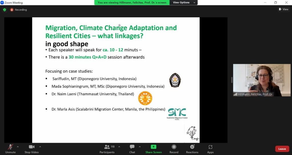 Pada hari Kamis, 19 Januai 2023 telah berlangsung kegiatan Urban & Regional Scientific Forum (URSF) 2023 Series #01 yang berkolaborasi dengan NUPS-Webinar Nr. 12 (Technische Universität Berlin, Germany) secara daring melalui Zoom Meeting. Tema diskusi pada webinar tersebut ialah Migration, Climate Change Adaptation and Resilient Cities – What Linkages?, dan secara umum dapat terkait dengan Tujuan Pembangunan Berkelanjutan 13 (Penanganan Perubahan Iklim), dan Tujuan Pembangunan Berkelanjutan 11 (Kota dan Pemukiman yang Berkelanjutan). Pada kesempatan tersebut, Prof. Dr.-Ing. Wiwandari Handayani selaku Ketua Departemen Perencanaan Wilayah dan Kota Universitas Diponegoro memberikan opening remarks. Prof. Dr. Felicitas Hillmann sebagai Head of the FIS-Networking Unit Paradigm Shift (NUPS) at Technische Universität Berlin sebagai moderator webinar kali ini yang menghadirkan empat narasumber yang akan menyoroti menyoroti keterkaitan antara migrasi dan adaptasi perubahan iklim sebagai komponen kunci untuk membangun kota yang lebih tangguh dan berkelanjutan. Pemaparan materi dari kedua pembicara di awal sesi berfokus pada studi kasus di Indonesia, sedangkan dua sesi berikutnya berfokus pada studi kasus di Thailand dan Filipina Dr. (Cand) Sariffudin, MT (Universitas Diponegoro – Indonesia) sebagai speaker pertama menjabarkan tentang penelitiannya yang berjudul “Housing Displacement and Replacement in Coastal flood-prone areas: evidence from land building tax-based study in Indonesia”. Sementara itu, Dr. (Cand) Mada Sophianingrum, MT, MSc (Universitas Diponegoro – Indonesia) memaparkan tentang “Linking Climate Change to Livelihood Strategies: The Role of Rural Migration”. Dr. Naim Laeni dari Thammasat University – Thailand memberi paparan terkait dengan “Bangkok’s Climate Risks: The ‘Serious Need’ for Resilience Climate Adaptation”. Pemateri terakhir yaitu Dr. Maruja Asis dari Scalabrini Migration Center, Manila – the Philippines memaparkan tentang “The Migration-Climate Change Nexus Plus Governance: The Case of Baguio City, the Philippines”. Catatan penting dalam diskusi tersebut diantaranya ialah dalam dekade terakhir, istilah ‘ketahanan’ menjadi semakin menonjol untuk memahami dan menganalisis kapasitas individu, komunitas, dan sistem untuk bertahan hidup, beradaptasi, dan tumbuh dalam menghadapi tekanan dan guncangan. Meskipun migrasi sering dikaitkan dengan gangguan dan tantangan, penerapan konsep ini dalam kaitannya dengan pemukiman dan integrasi migran relatif baru – terutama jika berkaitan dengan keterkaitannya dengan proses perubahan iklim yang berjalan lambat. Namun, dalam kondisi tertentu, migrasi dapat berfungsi sebagai strategi adaptasi dan gerakan menjadi strategi ketahanan yang penting bagi komunitas dan individu yang menghadapi perubahan iklim. Kegiatan Webinar URSF Pertama tahun 2023 berjalan dengan baik, ditandai dengan antusiasme para peserta yang mencapai 142 peserta tidak hanya dari kalangan mahasiswa dan dosen di lingkup Universitas Diponegoro, namun juga civitas akademika dari universitas lainnya baik di Indonesia maupun luar negeri, perwakilan instansi pemerintahan, NGO serta alumni Universitas Diponegoro.