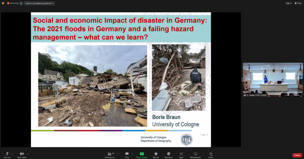 Prof. Dr. Boris Braun dari Institute of Geography Universitas Cologne, Jerman menyampaikan materi terkait “social and economic impact of disaster in Germany”. Sementara itu Prof. Dr.-Ing. Wiwandari Handayani dari Departemen Perencanaan Wilayah dan Kota Universitas Diponegoro menjabarkan tentang “Building climate change adaptation and resilience: an Indonesian Context. Sebagai moderator Konstantin Gisevius, MS.c dari Institute of Geography Universitas Cologne, Jerman.