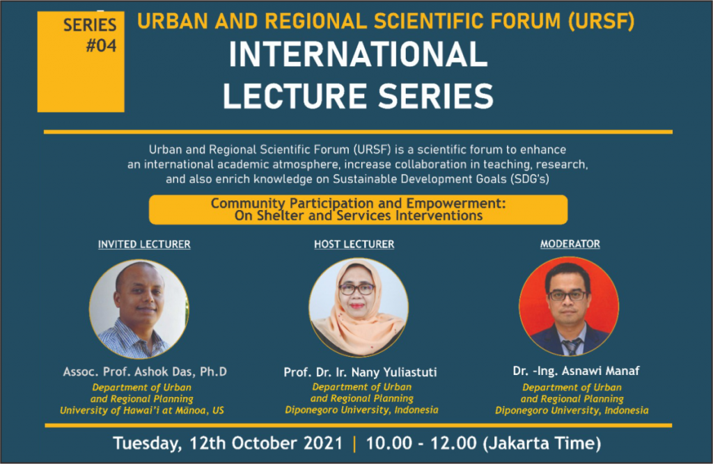 Pada hari Selasa, 12 Oktober 2021 telah berlangsung kegiatan International Lecture Series 2021 seri keempat secara daring via Zoom dan disiarkan melalui kanal Youtube. Tema kegiatan tersebut ialah Community Participation and Empowerment: On Shelter and Services Interventions yang erat kaitannya dengan Tujuan Pembangunan Berkelanjutan ke-11 (Kota dan Komunitas Berkelanjutan). Kegiatan ini dimoderatori oleh Dr.-Ing. Asnawi […]
