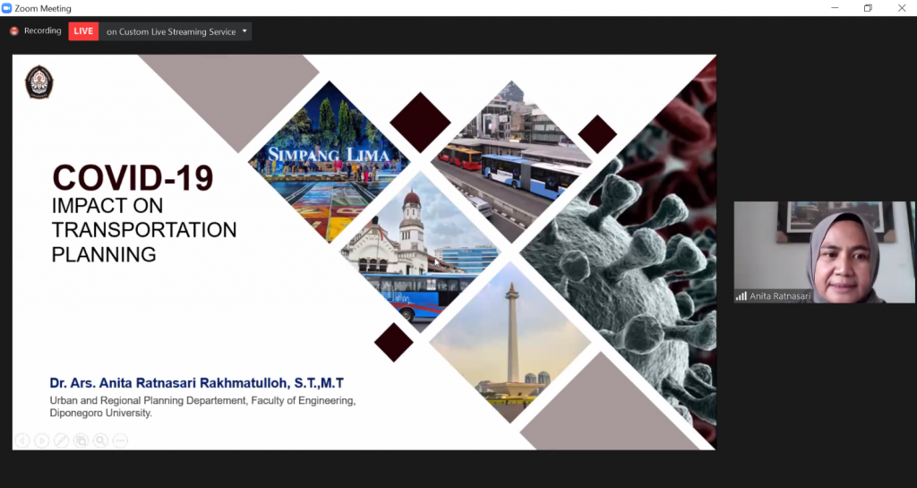 Pada hari Kamis, 21 Oktober 2021 telah dilaksanakan kegiatan International Lecture Series 2021 seri kelima dengan tema Sustainabilities in Cities secara daring via Zoom dan disiarkan melalui kanal Youtube. Tema kegiatan kali ini secara umum dapat terkait dengan Tujuan Pembangunan Berkelanjutan 11 (Kota dan Komunitas Berkelanjutan). Pada kesempatan tersebut, Assoc. Prof. Tae-Hyoung Tommy Gim, Ph.D sebagai pakar di bidang transportasi dan lingkungan dari Seoul National University, Korea Selatan memberi paparan tentang “Sustainabilities in Cities: Present and Future Impact of COVID-19”. Sesi berikutnya dilanjutkan oleh paparan dari Dr.ars. Anita Ratnasari dari Departemen Perencanaan Wilayah dan Kota tentang penelitiannya di DKI Jakarta yang berjudul “COVID-19 Impact on Transportation Planning”. Adapun jumlah peserta yang mengikuti kegiatan tersebut adalah 83 peserta khususnya dari mahasiswa program S1 dan S2 Perencanaan Wilayah dan Kota, dan diikuti oleh peserta dari universitas lain. Catatan penting dalam International Lecture Series kali ini ialah bahwa adanya pandemi berdampak pada kondisi sistem transportasi di berbagai negara. Dari pandemi ini secara tidak langsung memaksa berbagai pihak untuk lebih siap menghadapi kondisi di masa depan dan memberi kesempatan untuk merancang sistem transportasi yang lebih baik (tangguh, berkelanjutan, dan berkeadilan sosial). Kegiatan yang dimoderatori oleh Dr. Yudi Basuki berjalan dengan baik hingga akhir acara.