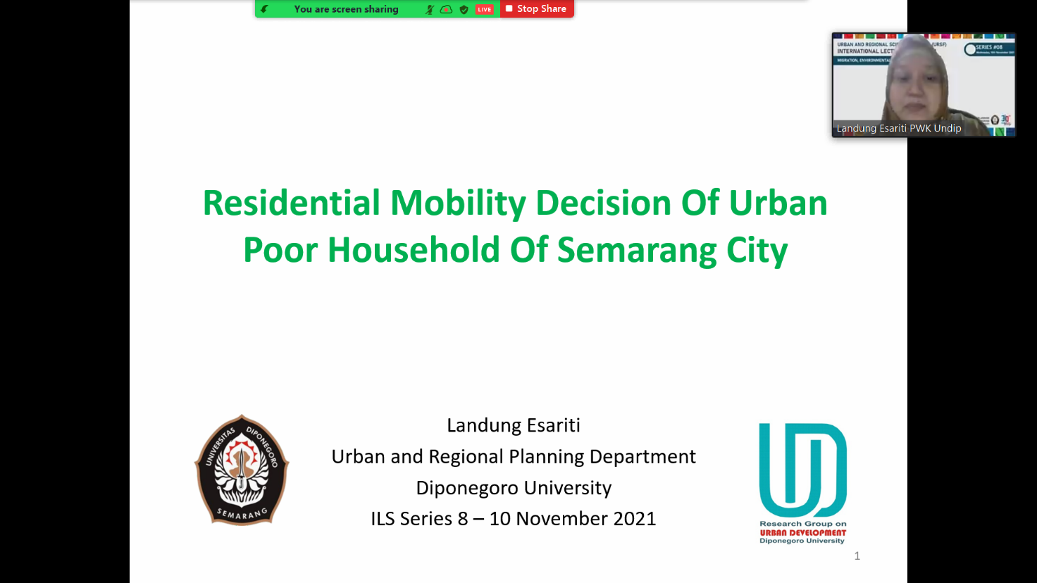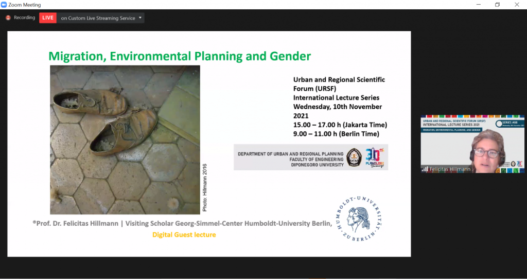 Pada hari Rabu, 10 November 2021 telah berlangsung kegiatan International Lecture Series 2021 dengan tema Migration, Environmental Planning, and Gender. Tema kegiatan seri keenam ini terkait dengan Tujuan Pembangunan Berkelanjutan 11 tentang Kota dan Komunitas Berkelanjutan, dan Tujuan Pembangunan Berkelanjutan 5 tentang Kesetaraan Gender. Jumlah peserta dalam International Lecture Series 2021 kali ini adalah 168 peserta yang berasal dari civitas akademik dan alumni Universitas Diponegoro. Pada kesempatan tersebut, turut hadir Prof. Dr. Felicitas Hillmann dari Georg-Simmel-Center for Metropolitan Studies at Humboldt-University, Berlin, Jerman. Dalam paparannya, Prof. Dr. Felicitas Hillmann menjelaskan tentang “Migration, Environmental Planning, and Gender”. Sesi berikutnya dilanjutkan oleh paparan dari Ibu Landung Esariti, MPS dari Departemen Perencanaan Wilayah dan Kota tentang penelitian beliau yang berjudul “Residential Mobility Decision of Urban Poor Household of Semarang City”. Pada kegiatan ini Ibu Maya Damayanti, Ph.D bertindak sebagai moderator kegiatan yang memandu sesi paparan, diskusi hingga akhir kegiatan. Dari kedua paparan tersebut, dapat disimpulkan bahwa kemampuan untuk bermigrasi dapat dipengaruhi oleh berbagai faktor sosial yang saling bersinggungan dan transisi perjalanan hidup seperti jenis kelamin, usia, etnis, pendidikan formal, jaringan sosial, dan status perkawinan. Mobilitas bukanlah pilihan bagi setiap orang, dimana peran gender, pendidikan dan faktor sosial lainnya yang menentukan mobilitas dan imobilitas. Selain itu, dalam konteks perencanaan lingkungan membutuhkan lebih banyak penelitian berbasis gender untuk memungkinkan perspektif perencanaan yang lebih luas.
