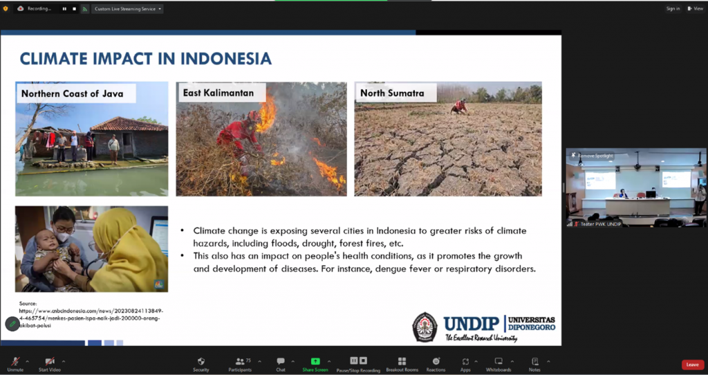 Prof. Dr. Boris Braun from the Institute of Geography at the University of Cologne, Germany, regarding “Social and Economic Impact of Disasters in Germany.” Meanwhile, Prof. Dr.-Ing. Wiwandari Handayani from the Department of Urban and Regional Planning at Diponegoro University explained about”Building Climate Change Adaptation and Resilience: An Indonesian Context.” The moderator was Konstantin Gisevius, M.Sc., from the Institute of Geography at the University of Cologne, Germany.