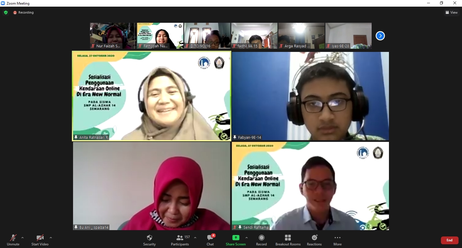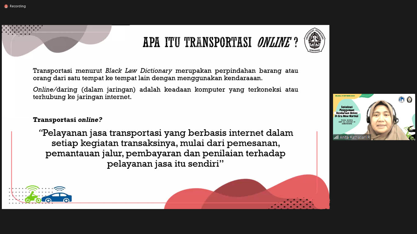 Pada Selasa, 27 Oktober 2020 lalu, Dr. Anita Ratnasari Rakhmatulloh selaku ketua Pengabdian Masyarakat dari DPWK melakukan sosialisasi secara online dengan judul : Sosialisasi Penggunaan Kendaraan Online di Era New Normal pada Siswa SMP Al-Azhar 14 Semarang.