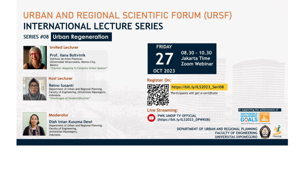 International Lecture Series #08 diselenggarakan pada hari Jumat, 27 Oktober 2023 secara online melalui Zoom Meeting. Tema diskusi pada webinar tersebut ialah Urban Regeneration yang terkait dengan Tujuan Pembangunan Berkelanjutan 11 (Kota dan Pemukiman yang Berkelanjutan). Pada kesempatan tersebut, Ibu Diah Intan Kusuma Dewi dari Departemen Perencanaan Wilayah dan Kota, Universitas Diponegoro sebagai moderator yang […]