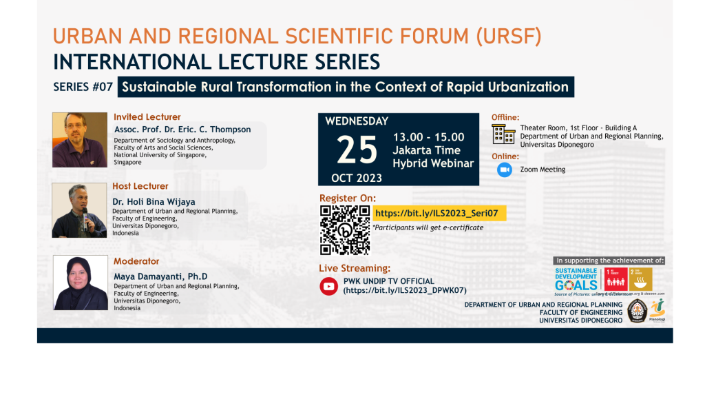 Pada hari Rabu, 25 Oktober 2023 telah berlangsung kegiatan International Lecture Series #07 yang dilaksanakan secara hybrid bertempat di Ruang Teater Departemen Perencanaan Wilayah dan Kota, Universitas Diponegoro dan Zoom Meeting. Tema diskusi pada webinar tersebut ialah Sustainable Rural Transformation in the Context of Rapid Urbanization, dan secara umum dapat terkait dengan Tujuan Pembangunan Berkelanjutan […]