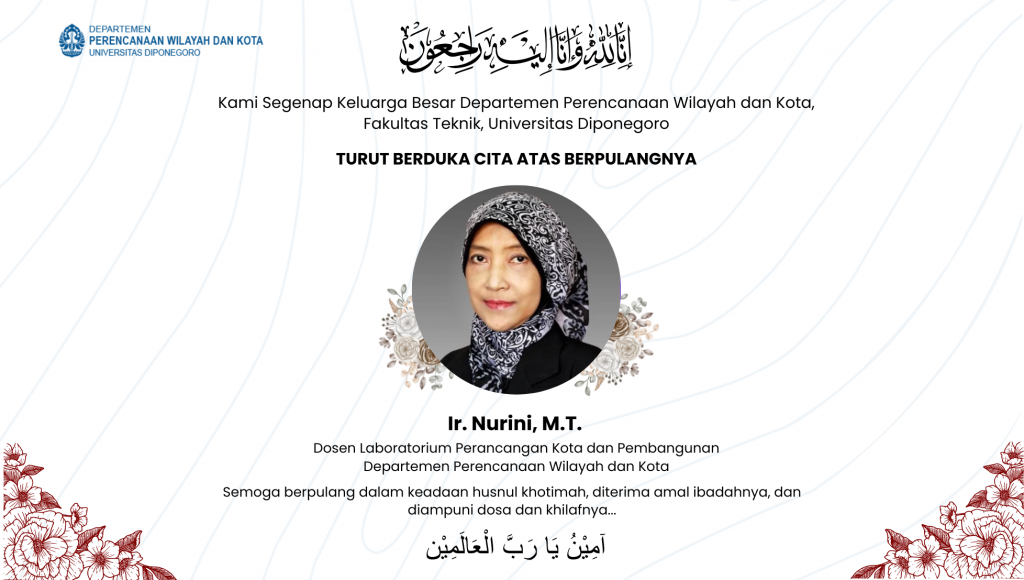Innaa lillahi wa innaa ilaihi rooji’uun, Segenap Civitas Akademika Departemen Perencanaan Wilayah dan Kota Fakultas Teknik Universitaa Diponegoro turut berduka cita atas wafatnya salah satu dosen kami Ibu Ir. Nurini, M.T. Semoga Almarhumah husnul khotimah. Diterima amal ibadahnya dan diampuni dosanya dan khilafnya. Serta keluarga beliau diberikan ketabahan dan kekuatan.
