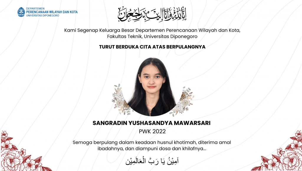 Innaa lillahi wa innaa ilaihi rooji’uun, Kami segenap keluarga besar Departemen Perencanaan Wilayah dan Kota Fakultas Teknik Universitas Diponegoro turut berduka cita atas berpulangnya Sangradin Yushasandya Mawarsari (PWK 2022) Semoga berpulang dalam keadaan husnul khotimah. Diterima amal ibadahnya dan diampuni dosa dan khilafnya Aamiin ya Robbal ‘Aalamiin