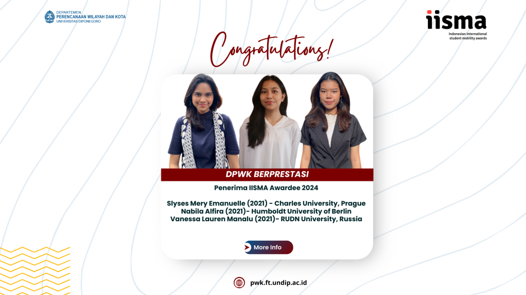 Selamat kepada Mahasiswa Departemen Perencanaan Wilayah dan Kota Undip yang terpilih menjadi Indonesian International Student Mobility Awardee (IISMA) 2024 1. Slyses Merryl Emanuelle (2021) @douxliebe, Charles University, Prague 2. Nabila Alfira (2021) @nabilalfr, Humboldt University of Berlin 3. Vanessa Lauren Manalu (2021) @vnlwrn, RUDN University, Russia Good luck and all the best on your Study
