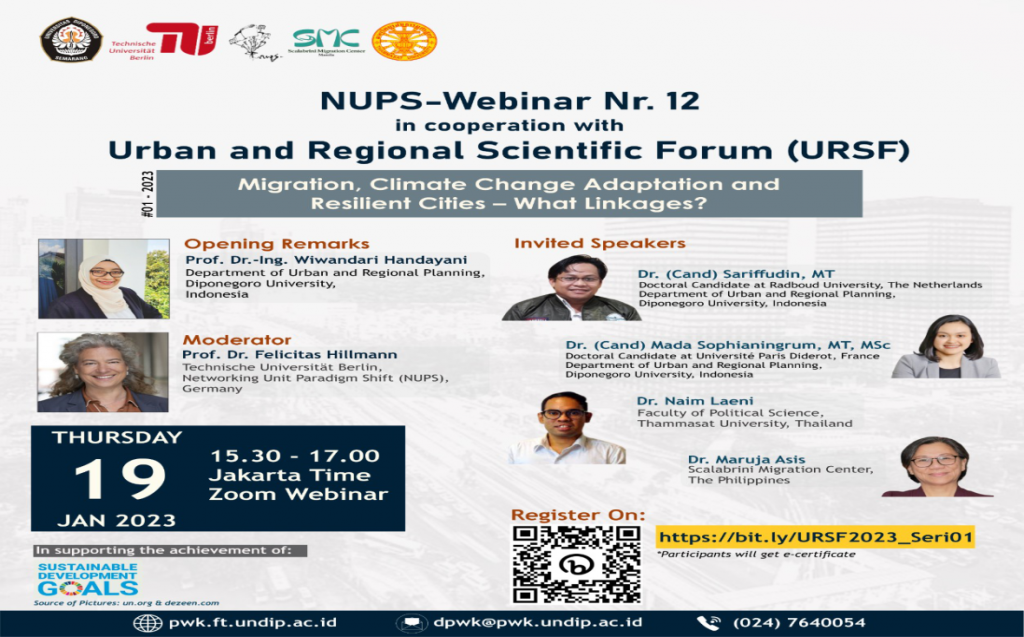 Pada hari Kamis, 19 Januai 2023 telah berlangsung kegiatan Urban & Regional Scientific Forum (URSF) 2023 Series #01 yang berkolaborasi dengan NUPS-Webinar Nr. 12 (Technische Universität Berlin, Germany) secara daring melalui Zoom Meeting. Tema diskusi pada webinar tersebut ialah Migration, Climate Change Adaptation and Resilient Cities – What Linkages?, dan secara umum dapat terkait dengan […]