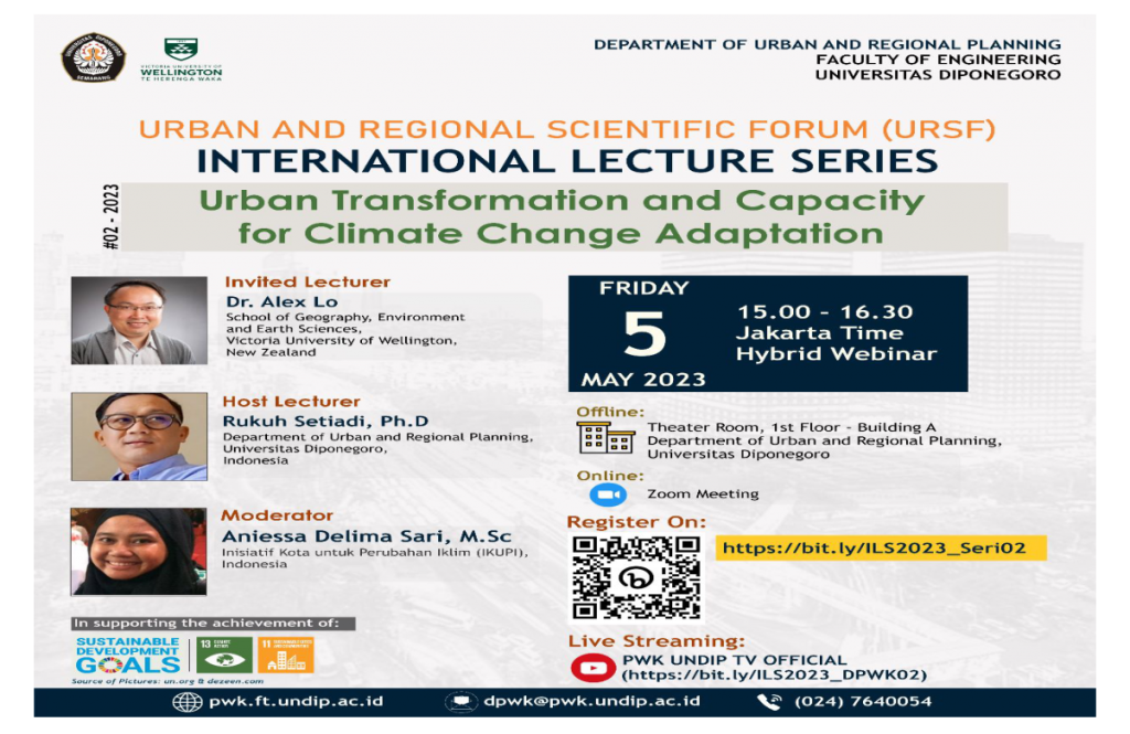 Pada hari Jumat, 5 Mei telah berlangsung kegiatan International Lecture Series #02 yang dilaksanakan secara hybrid bertempat di Ruang Teater Departemen Perencanaan Wilayah dan Kota, Universitas Diponegoro dan Zoom Meeting. Tema diskusi pada webinar tersebut ialah Urban Transformation and Capacity for Climate Change Adaptation, dan secara umum dapat terkait dengan Tujuan Pembangunan Berkelanjutan 13 (Penanganan […]