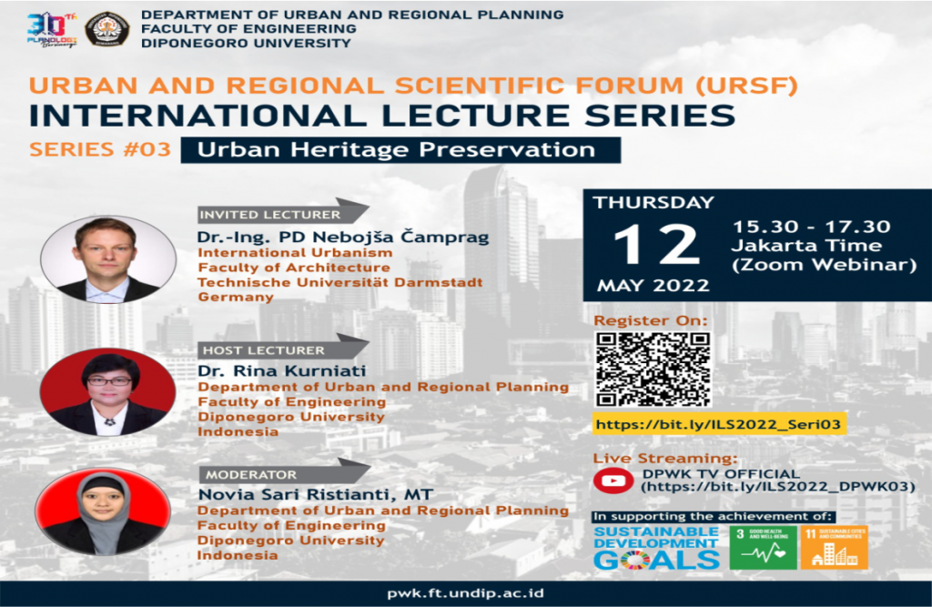 Pada hari Kamis, 12 Mei 2022 telah dilaksanakan kegiatan International Lecture Series 2022 seri ketiga dengan tema Urban Heritage Preservation secara daring via Zoom dan disiarkan melalui kanal Youtube. Tema kegiatan kali ini secara umum dapat terkait dengan Tujuan Pembangunan Berkelanjutan 3 (Kehidupan Sehat dan Sejahtera), dan Tujuan Pembangunan Berkelanjutan 11 (Kota dan Komunitas Berkelanjutan). […]