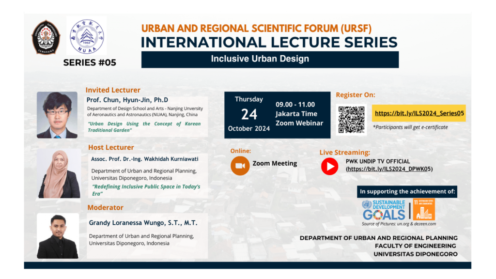 Pada hari Kamis, 25 Oktober 2024 telah berlangsung International Lecture Series #05 diselenggarakan secara sinkronus melalui zoom meeting dan asinkronus melalui YouTube. Tema diskusi webinar tersebut ” Inclusive Urban Design”, berkaitan erat dengan tujuan pembangunan berkelanjutan 11 (Kota dan Permukiman yang berkelanjutan). Pada kesempatan tersebut. Prof. Dr-Ing. Wiwandari Handayani selaku Ketua Departemen Perencananaan Wilayah dan […]