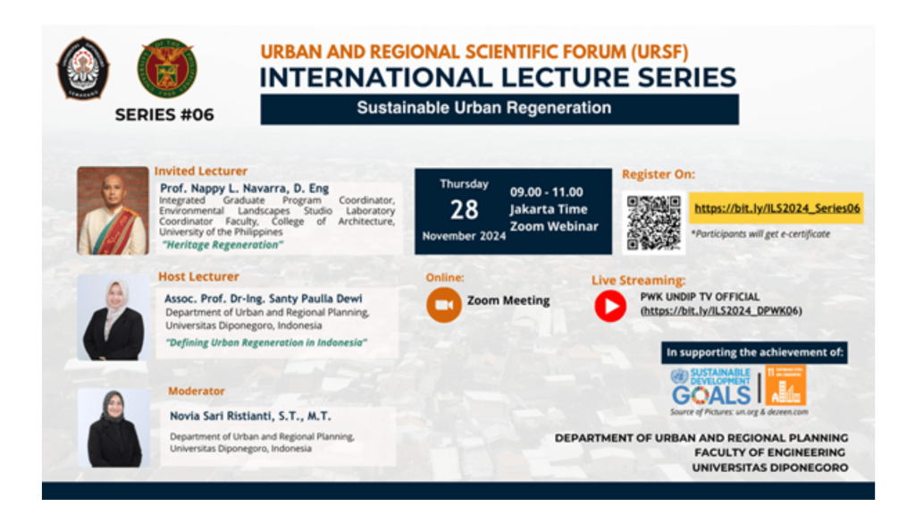 Kamis, 28 November 2024 telah berlangsung International Lecture Series #06 diselenggarakan secara sinkronus melalui zoom meeting dan asinkronus melalui YouTube. Tema diskusi webinar tersebut “Sustainable Urban Regeneration”, berkaitan erat dengan tujuan pembangunan berkelanjutann 11 (Kota dan Permukiman yang Berkelanjutan). Pada kesempatan tersebut Prof. Dr.-Ing. Wiwandari Handayani selaku Ketua Departemen Perencanaan Wilayah dan Kota Universitas Diponegoro […]