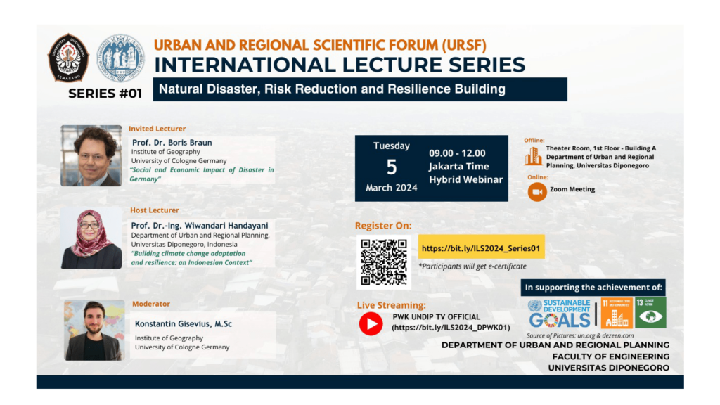 Pada hari Selasa, 5 maret 2024 telah berlangsung keviatan International Lecture Series #01 yang dilaksanakan secara sinkronus (zoom meeting) dan asinkronus (hybrid). Tema diskusi pada webinar tersebut ialah “Natural Disaster, Risk Reduction and Resilience Building” yang terkait dengan tujuan pembangunan berkelanjutan 11 (Kota dan Permukiman yang Berkelanjutan) dan tujuan pembangunan berkelanjutan 13 (penanganan perubahan iklim). […]