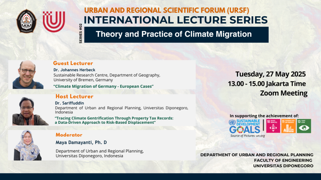 Departemen Perencanaan Wilayah dan Kota, pada hari Selasa, 27 Mei 2025 telah menyelenggarakan kegiatan International Lecture Series (ILS) #02 dengan tema Theory and Practice of Climate Migration. Kegiatan ini diselenggarakan secara sinkronus melalui zoom meeting dan asinkronus melalui YouTube DPWK UNDIP. Tema diskusi webinar tersebut berkaitan erat Sustainable Development Goals dengan tujuan pembangunan berkelanjutan 10 […]