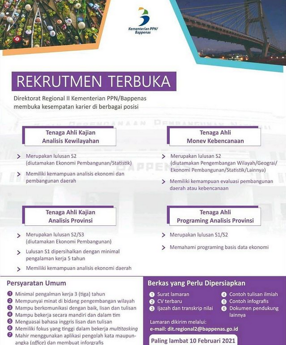 Direktorat Regional II Kementerian PPN/Bappenas mengadakan lowongan pekerjaan dengan beberapa posisi yaitu tenaga ahli kajian analisis kewilayahan, tenaga ahli monev kebencanaan, tenaga ahli kajian analisis provinsi, dan tenaga ahli programing analisis provinsi. Info lebih lanjut dapat dilihat pada gambar diatas.