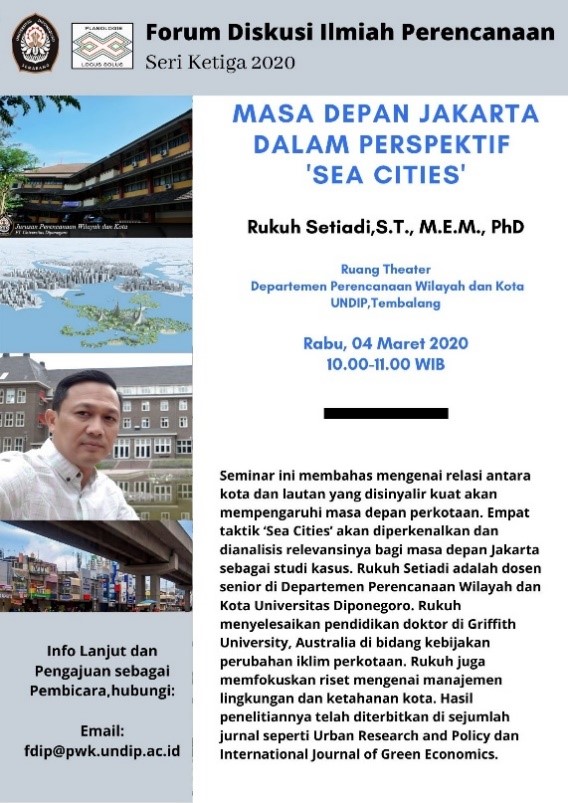 Pada tahun 2020, series ketiga dilaksanakan secara tatap muka dan online, karena sejak pertengahan tahun terjadi pandemi Covid-19. Forum tatap muka terakhir dilakukan pada tanggal 04 Maret 2020 di Ruang Teather Gedung A DWPK UNDIP. Tema yang diangkat yaitu Masa Depan Jakarta Dalam Perspektif “Sea Cities” dengan pembicara yaitu Rukuh Setiadi, S.T., M.E.M., P.hD sebagai Dosen PWK Undip yang handal dalam tema tersebut.