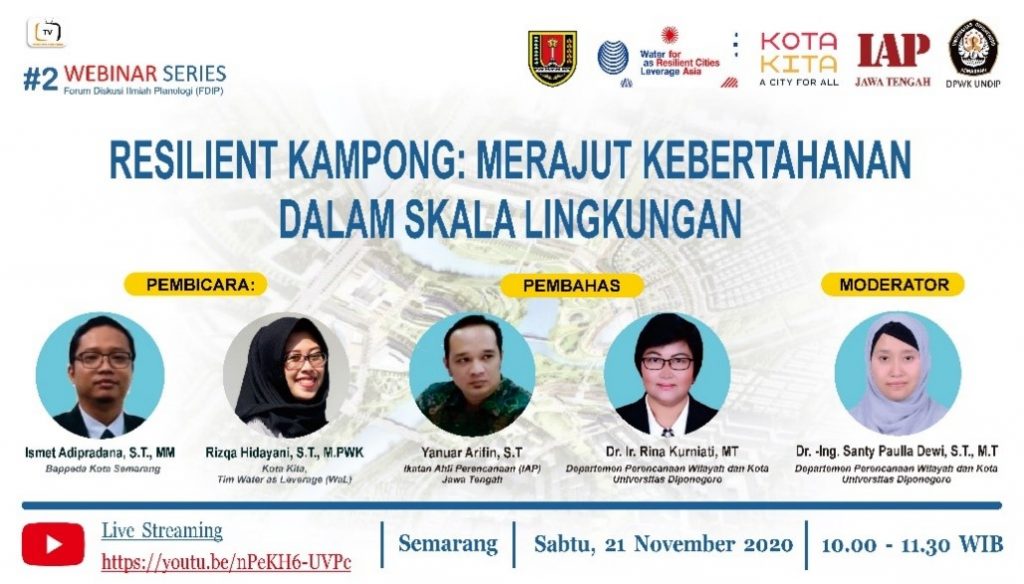 Selanjutnya forum FDIP dilakukan secara online melalui Zoom dan disiarkan di Youtube. Terdapat dua kali webinar di tahun 2020 dan satu kali di tahun 2021 yang dilaksanakan secara online. Webinar series #1 dilaksanakan pada 19 September 2020 dengan tema “Rechanneling The City : Desain Infrastruktur Jaringan Air Perkotaan Yang Berkelanjutan”. Webinar series #2 dilaksanakan pada 21 November 2020 dengan tema “Resilient Kampong: Merajut Kebertahanan Dalam Skala Lingkungan”. Webinar series #3 dengan tema “Data Science: Menuju Kota Berketahanan Tanpa Banjir”. Pembicara yang mengisi webinar merupakan dosen dan para pakar yang handal dalam tema tersebut. Ketiga series tersebut menghadirkan pembicara dari luar yakni dari Bappeda Kota Semarang, Ikatan Arsitektur Lansekap Indonesia (IALI) Jawa Tengah, Tim Water as Leverage (WaL), Pemerintah Kota Semarang dan Ikatan Ahli Perencanaan (IAP) Jawa Tengah.
