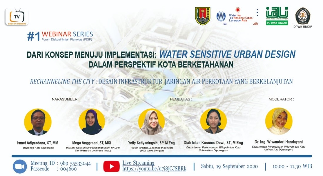 Selanjutnya forum FDIP dilakukan secara online melalui Zoom dan disiarkan di Youtube. Terdapat dua kali webinar di tahun 2020 dan satu kali di tahun 2021 yang dilaksanakan secara online. Webinar series #1 dilaksanakan pada 19 September 2020 dengan tema “Rechanneling The City : Desain Infrastruktur Jaringan Air Perkotaan Yang Berkelanjutan”. Webinar series #2 dilaksanakan pada 21 November 2020 dengan tema “Resilient Kampong: Merajut Kebertahanan Dalam Skala Lingkungan”. Webinar series #3 dengan tema “Data Science: Menuju Kota Berketahanan Tanpa Banjir”. Pembicara yang mengisi webinar merupakan dosen dan para pakar yang handal dalam tema tersebut. Ketiga series tersebut menghadirkan pembicara dari luar yakni dari Bappeda Kota Semarang, Ikatan Arsitektur Lansekap Indonesia (IALI) Jawa Tengah, Tim Water as Leverage (WaL), Pemerintah Kota Semarang dan Ikatan Ahli Perencanaan (IAP) Jawa Tengah.