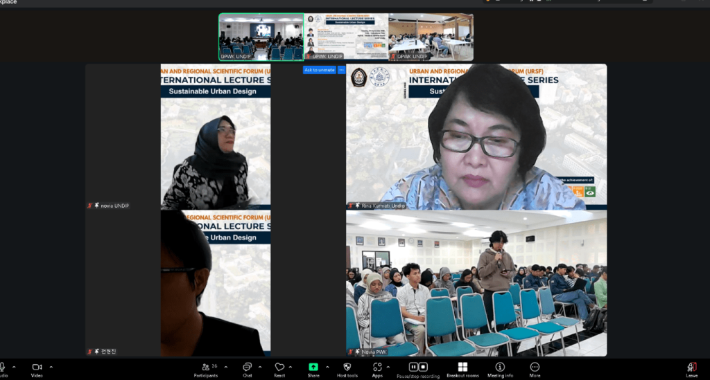 Prof. D.-Ing. Wiwandari Handayani selaku Ketua Departemen Perencanaan Wilayah dan Kota Undip dalam sambutan pembukaannya  mendorong mahasiswa untuk memperluas wawasan global dan mendapatkan gagasan untuk tema riset Tugas Akhir melalui kegiatan ILS ini. Diskusi dimoderatori oleh Novia Sari Ristianti, S.T., M.T. dari Departemen Perencanaan Wilayah dan Kota Undip dengan menghadirkan dua narasumber. Materi pertama disampaikan oleh Prof. Chun, Hyun-Jin, Ph.D dari Department pf Design School and Arts, Nanjing University of Aeronatics and Astronautics (NUAA), Nanjing, China  yang membahas  “AI Technology for Sustainable Urban Design”, serta Prof. Dr. Ars. Ir. Rina Kurniati dari Departemen Perencanaan Wilayah dan Kota Undip menyampaikan materi “Ecological Significance of Sustainable Urban Design”.