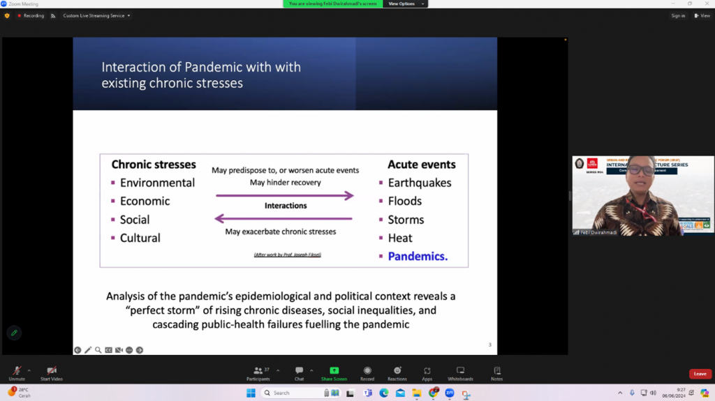 Pada hari Kamis, 6 Juni 2024 telah berlangsung kegiatan International Lecture Series #04 secara sinkronus (zoom meeting) dan asinkronus (YouTube). Tema diskusi webinar tersebut “Community Need Assessment” yang berkaitan erat dengan tujuan pembangunan berkelanjutan 11 (Kota dan Permukiman yang Berkelanjutan) dan tujuan pembangunan berkelanjutan 13 (Penanganan Perubahan Iklim). Pada kesempatan tersebut, Prof. Dr.-Ing. Wiwandari Handayani selaku Ketua Departemen Perencanaan Wilayah dan Kota Universitas Diponegoro memberikan opening remarks. Dalam remarksnya Beliau menyampaikan bahwa ini tahun ketiga kegiatan ILS di DPWK UNDIP yang melibatkan mitra akademisi dari berbagai institusi di berbagai negara yang membawa perspektif baru dalam mempelajari perencanaan wilayah dan kota. Samsul Ma’rif, SP, MT, dari Departemen Perencanaan Wilayah dan Kota Universitas Diponegoro sebagai moderator yang memandu diskusi dua pemateri. Materi pertama disampaikan oleh Febi Dwirahmadi, Ph.D dari Global Health Lecturer at School of Medicine and Dentistry, Griffith University, Queensland terkait “Evidenced Based Program Planning for Urban Health”. Sementara itu Ir. Agung Sugiri, MPSt dari Departemen Perencanaan Wilayah dan Kota Universitas Diponegoro, menjabarkan terkait “Equity in Equity Based Development”.