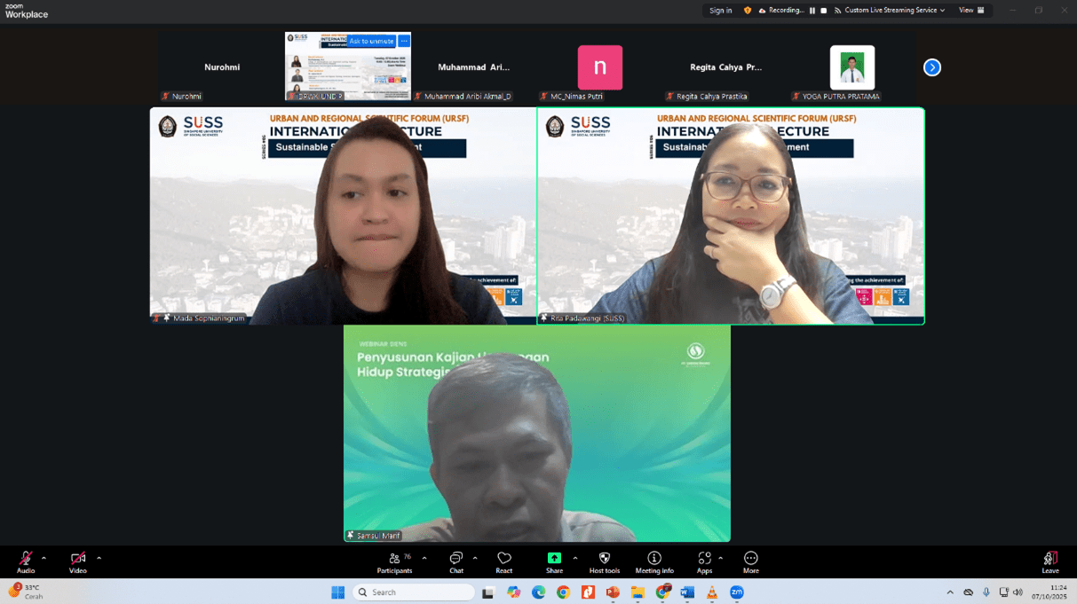 Pada hari Selasa, 07 Oktober 2025, Departemen Perencanaan Wilayah dan Kota Undip menyelenggarakan International Lecture Series #05 secara sinkronus melalui zoom meeting. Tema webinar kali ini adal “Sustainable Spatial Development” yang berkaitan erat dengan Tujuan Pembangunan Berkelanjutan no 10 (berkurangnya kesenjangan), Tujuan Pembangunan Berkelanjutan no 11 (kota dan komunitas berkelanjutan), dan Tujuan Pembangunan Berkelanjutan no 16 (perdamaian, keadilan dan lembaga yang kuat).