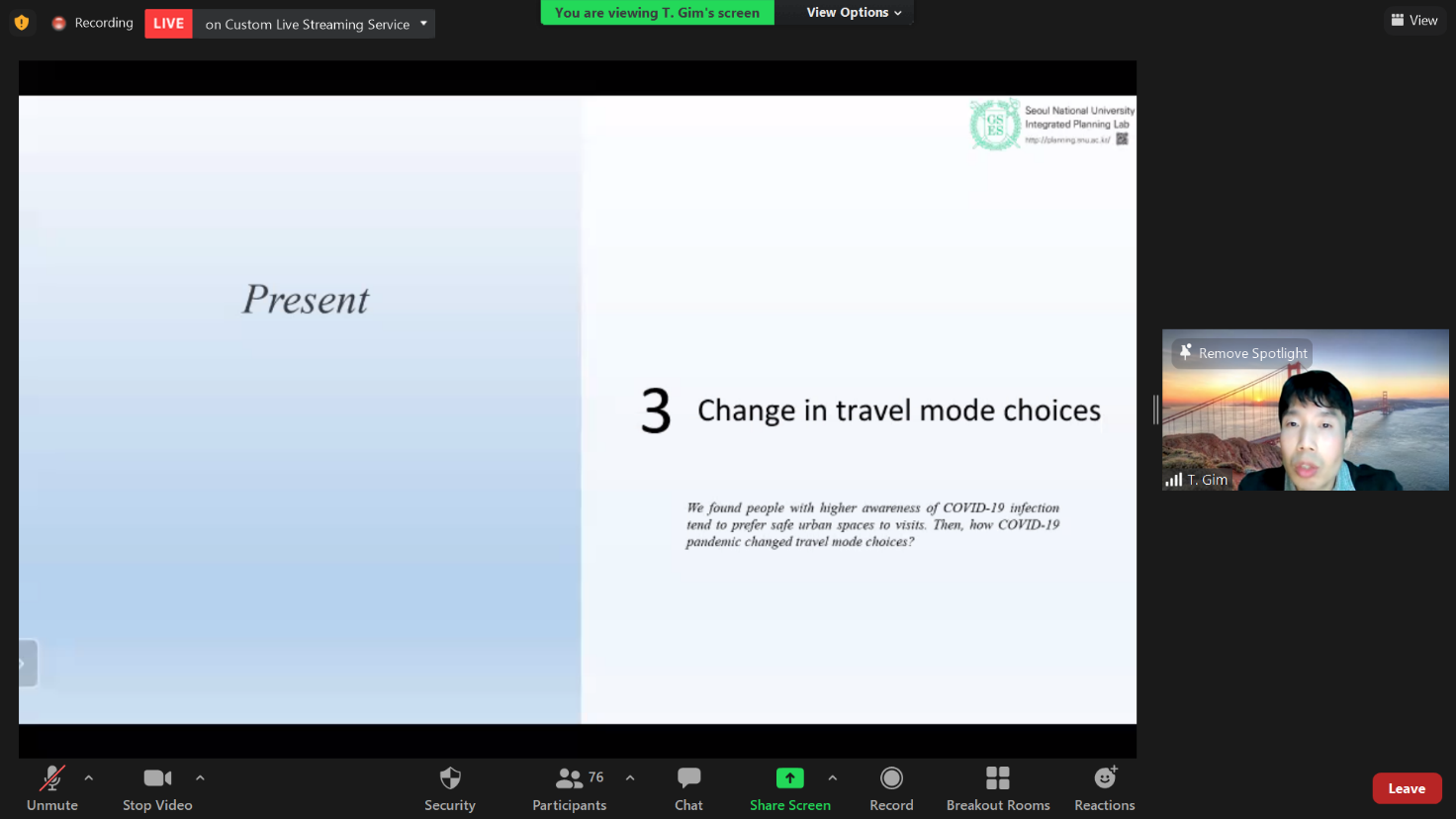 Pada hari Kamis, 21 Oktober 2021 telah dilaksanakan kegiatan International Lecture Series 2021 seri kelima dengan tema Sustainabilities in Cities secara daring via Zoom dan disiarkan melalui kanal Youtube. Tema kegiatan kali ini secara umum dapat terkait dengan Tujuan Pembangunan Berkelanjutan 11 (Kota dan Komunitas Berkelanjutan). Pada kesempatan tersebut, Assoc. Prof. Tae-Hyoung Tommy Gim, Ph.D sebagai pakar di bidang transportasi dan lingkungan dari Seoul National University, Korea Selatan memberi paparan tentang “Sustainabilities in Cities: Present and Future Impact of COVID-19”. Sesi berikutnya dilanjutkan oleh paparan dari Dr.ars. Anita Ratnasari dari Departemen Perencanaan Wilayah dan Kota tentang penelitiannya di DKI Jakarta yang berjudul “COVID-19 Impact on Transportation Planning”. Adapun jumlah peserta yang mengikuti kegiatan tersebut adalah 83 peserta khususnya dari mahasiswa program S1 dan S2 Perencanaan Wilayah dan Kota, dan diikuti oleh peserta dari universitas lain. Catatan penting dalam International Lecture Series kali ini ialah bahwa adanya pandemi berdampak pada kondisi sistem transportasi di berbagai negara. Dari pandemi ini secara tidak langsung memaksa berbagai pihak untuk lebih siap menghadapi kondisi di masa depan dan memberi kesempatan untuk merancang sistem transportasi yang lebih baik (tangguh, berkelanjutan, dan berkeadilan sosial). Kegiatan yang dimoderatori oleh Dr. Yudi Basuki berjalan dengan baik hingga akhir acara.