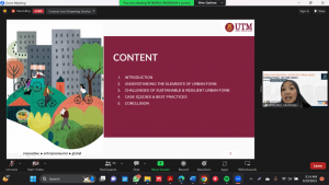 Pada hari Jumat, 29 September 2023 telah berlangsung kegiatan International Lecture Series #06 yang dilaksanakan secara daring dan disiarkan di kanal YouTube. Kegiatan ILS kali ini mengusung tema Sustainable Urban Form yang terkait dengan Tujuan Pembangunan Berkelanjutan 11 (Kota dan Pemukiman yang Berkelanjutan) dan Tujuan Pembangunan Berkelanjutan 8 (Pekerjaan yang Layak dan Pertumbuhan Ekonomi). Pada kesempatan tersebut, Ibu Diah Intan Kusuma Dewi, M.Eng dari Departemen Perencanaan Wilayah dan Kota sebagai moderator yang memandu diskusi dengan dua pemateri. Materi pertama disampaikan oleh Dr. Wan Nurul Mardiah Wan Mohd Rani dari Razak Faculty of Technology and Informatics, University of Technology Malaysia, Malaysia terkait Sustainable and Resilience Urban Form. Sementara itu, Grandy Loranessa Wungo, MT dari Departemen Perencanaan Wilayah dan Kota Diponegoro menjabarkan hasil penelitiannya tentang Measuring the Sustainability Performance of Mixed-Used Development in Semarang City using LEED Approach. Catatan penting dalam diskusi tersebut diantaranya dalam mewujudkan desain kota yang berkelanjutan dan berketahanan perlu memperhatikan aspek Ketahanan terhadap bencana dan perubahan iklim, keberlanjutan lingkungan, keberlanjutan sosial, dan keberlanjutan ekonomi. Kota perlu direncanakan, dirancang, dan dikembangkan untuk mengurangi dampaknya terhadap lingkungan, memiliki ketahanan terhadap dampak perubahan iklim, dan berkontribusi terhadap pertumbuhan ekonomi. Kegiatan yang dihadiri 134 peserta dari kalangan dosen, mahasiswa program S1-S2-S3 Perencanaan Wilayah dan Kota, Universitas Diponegoro maupun perwakilan institusi pemerintah secara daring melalui Zoom berjalan dengan lancar. Sesi diskusi berjalan dengan baik ditinjau dari tingginya antusiasme peserta dalam mengajukan pertanyaan dan tanggapan terhadap paparan yang telah disampaikan oleh para dosen.