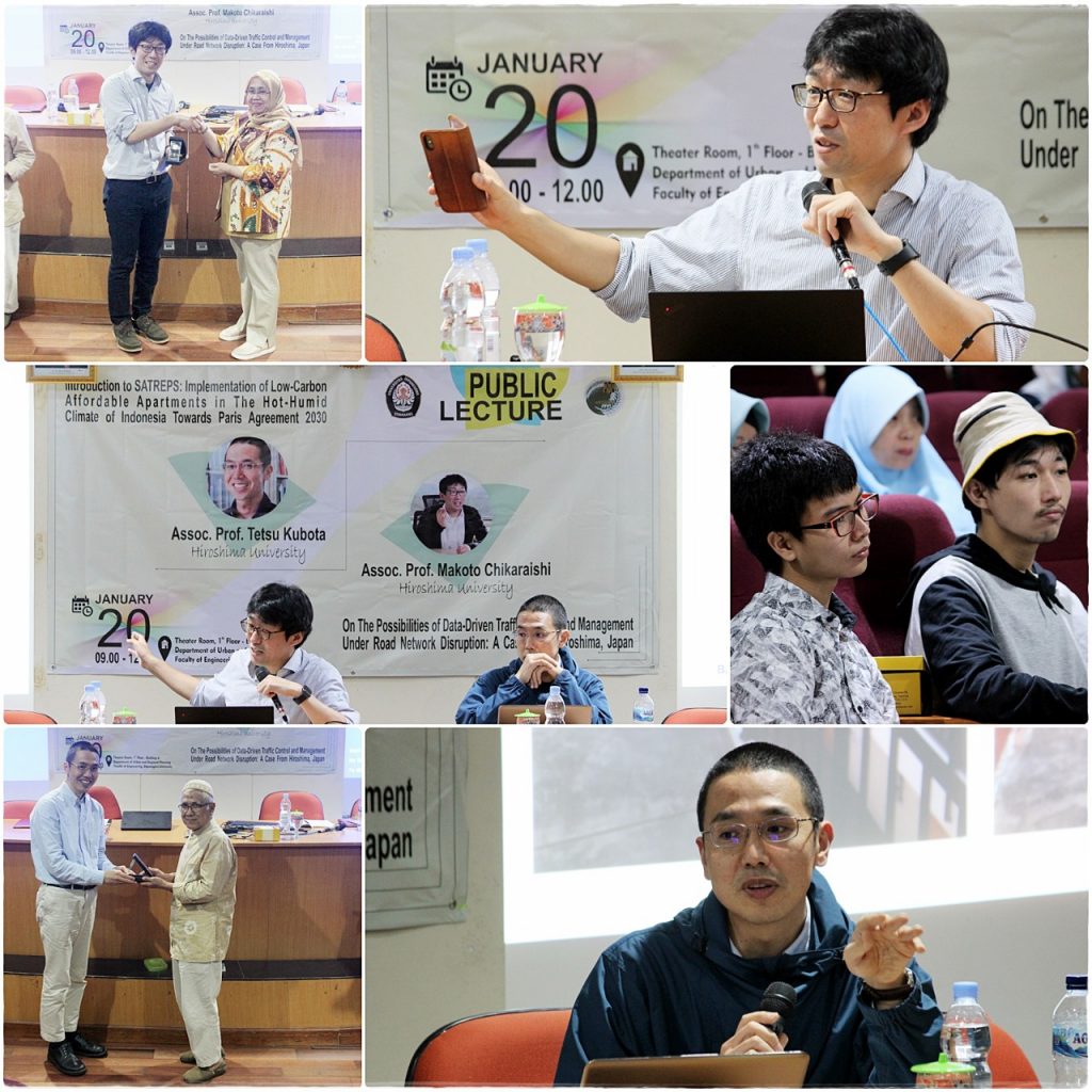 Public Lecture dilakukan pada Senin, 20 Januari 2020 bertempat di Ruang Theater Departemen Perencanaan Wilayah dan Kota, Universitas Diponegoro. Dalam acara ini terdapat 2 pembicara dari Universitas Hiroshima, Jepang yakni Dr. Makoto Chikaraishi dan Dr. Tetsu Kubota. Acara ini dilaksanakan mulai pukul 09.00-12.00 yang terbagi dalam 4 sesi yakni sekitar 15 menit pembukaan dan pengenalan narasumber, kemudian 1 jam berikutnya diisi dengan penyampaian materi dan 15 menit tanya jawab dengan Dr. Makoto Chikaraishi dengan materi “On The Possibilities of Data-Driven Traffic Control and Management Under Road Network Disruption: A Case from Hiroshima, Japan”, kemudian 1 jam berikutnya dilanjutkan pemaparan “Introduction to SATREPS: Implementation of Low-Carbon Affordable Apartement in The Hot-Humid Climate of Indonesia Towards Paris Agreement 2030” oleh Dr. Tetsu Kubota yang dilanjutkan dengan 15 menit tanya jawab. Kemudian 15 menit terakhir digunakan sebagai waktu penutupan acara dan sesi foto bersama.