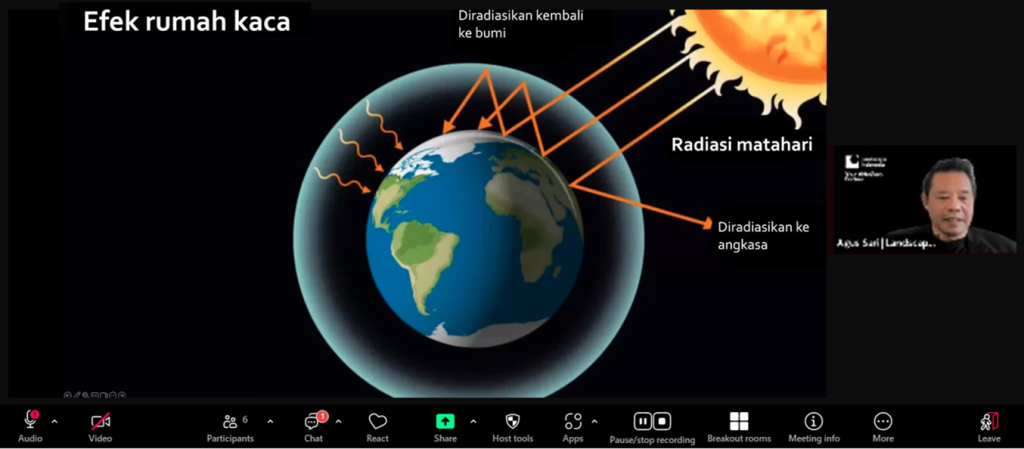 Pada perkuliahan ini, Pak Agus Sari menekankan bahwa krisis iklim tidak hanya menjadi ancaman untuk masa depan, melainkan kenyataan yang sudah berlangsung saat ini. Upaya mitigasi perubahan iklim untuk menurunkan emisi gas rumah kaca menjadi penting untuk mengurangi dampak yang semakin meluas dan menjaga keberlanjutan. Melalui perkuliahan ini, Pak Agus Sari menjelaskan konsep pasar karbon sebagai instrumen yang dapat meningkatkan efisiensi upaya penurunan emisi gas rumah kaca. Menurutnya, pasar karbon tidak secara langsung menurunkan emisi, tetapi memungkinkan mekanisme pendanaan yang lebih optimal sehingga dengan biaya yang sama, penurunan emisi bisa lebih besar; atau, dengan target penurunan emisi yang sama, biaya yang dikeluarkan bisa lebih kecil.