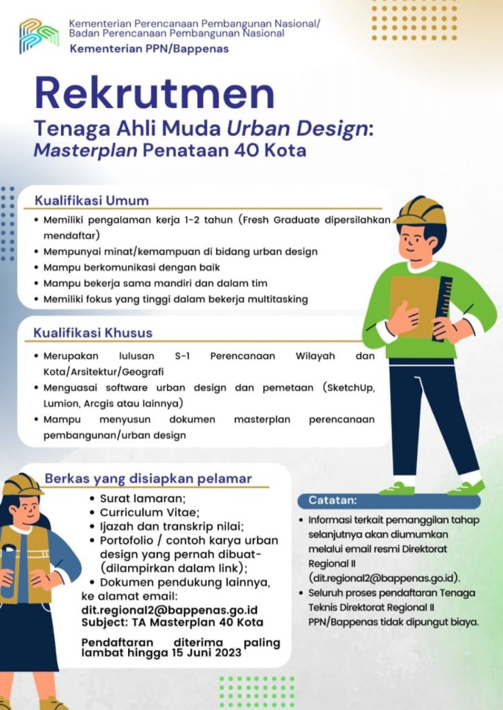 Kementerian PPN/Bappenas membuka rekruitmen tenaga ahli muda urban design: masterplan penataan 40 Kota.