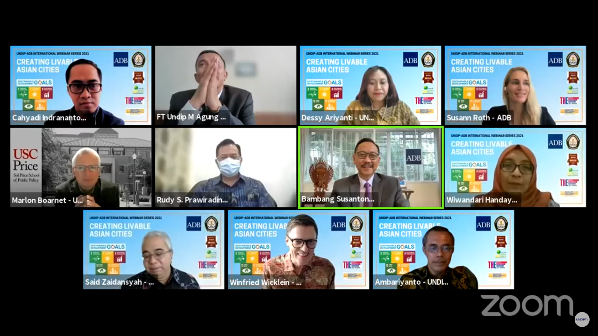 Hari Rabu, 09 Juni 2021 pukul 10:00-12:00 WIB (Jakarta Time) telah dilaksanakan International Webinar Series 2021 yang diselenggarakan oleh Universitas Diponegoro bekerja sama dengan Asian Development Bank. Webinar ini adalah bagian dari rangkaian Webinar Sustainable Development Goals (SDGs), dengan tema Creating Livable Asian Cities”. Rangkaian acara diawali dengan sambutan oleh Winfried Wicklein, Deputy Director General for Southeast Asia, ADB. Kemudian dilanjutkan dengan pembicara pertama yaitu DR. Suharso Monoarfa, Minister of National Development Planning (BAPPENAS) dan pembica kedua yaitu oleh DR. Bambang Susantono, Vice President for Knowledge Management and Sustainable Development, ADB.