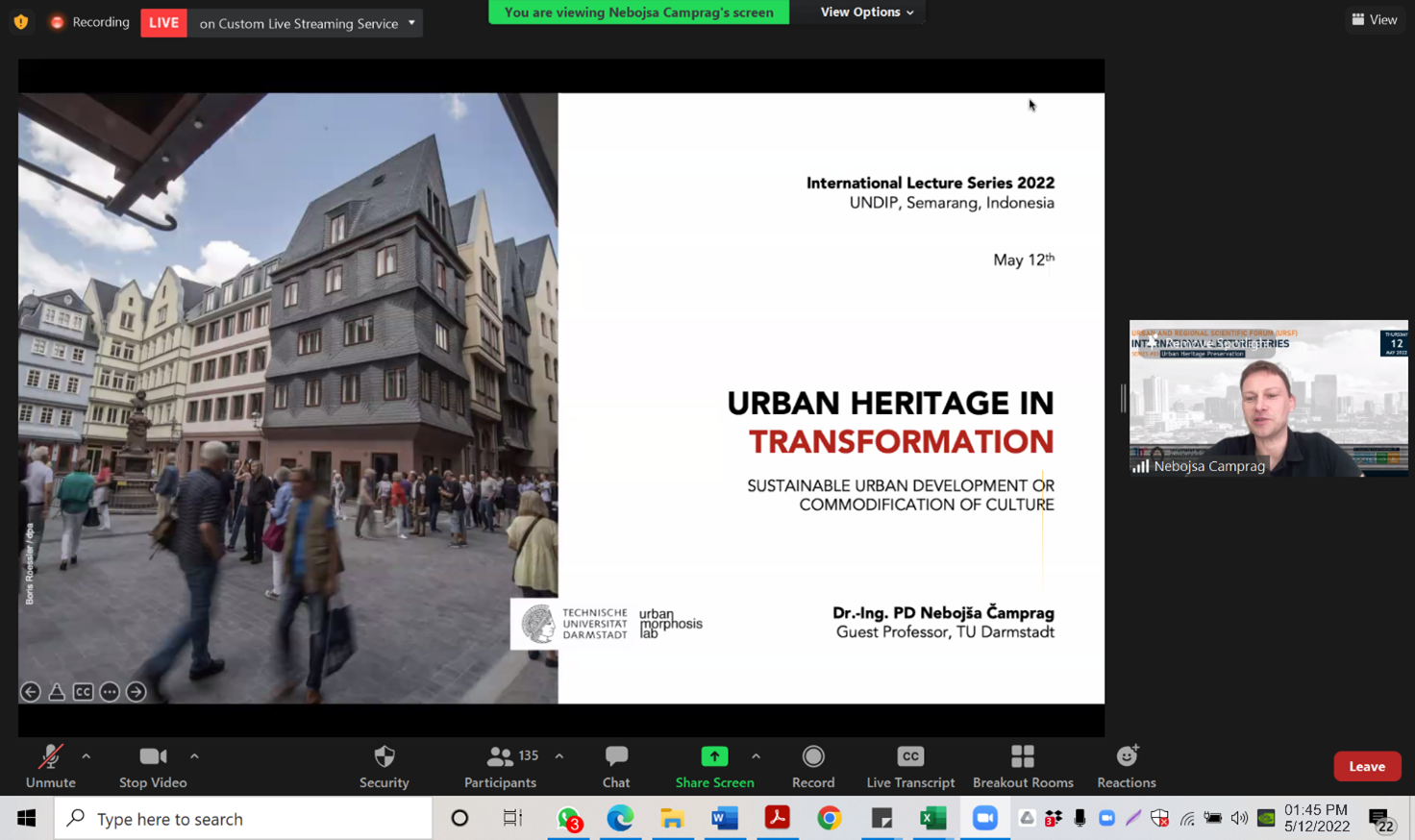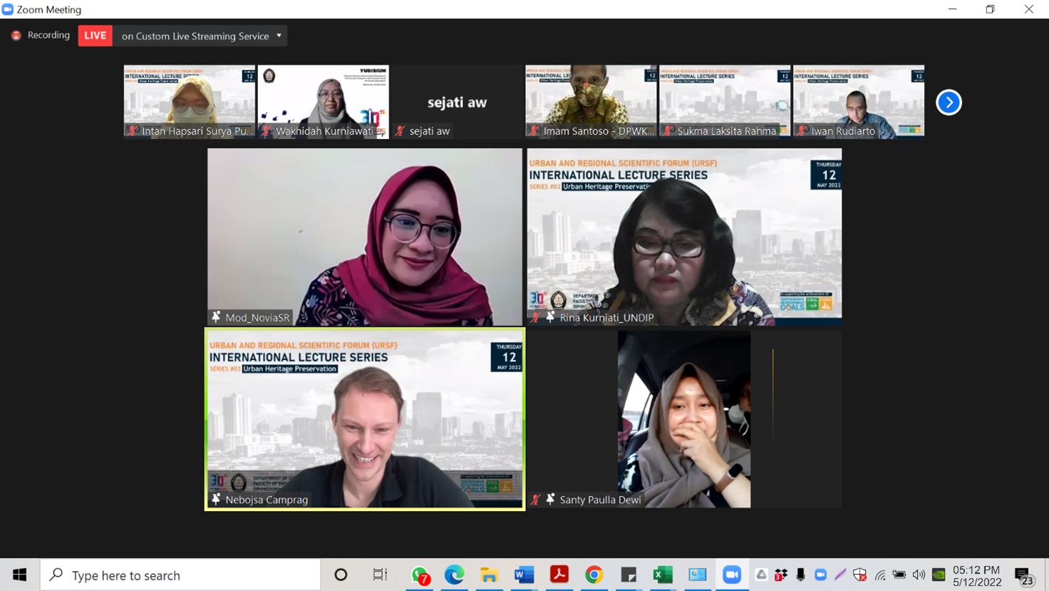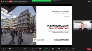 Pada hari Kamis, 12 Mei 2022 telah dilaksanakan kegiatan International Lecture Series 2022 seri ketiga dengan tema Urban Heritage Preservation secara daring via Zoom dan disiarkan melalui kanal Youtube. Tema kegiatan kali ini secara umum dapat terkait dengan Tujuan Pembangunan Berkelanjutan 3 (Kehidupan Sehat dan Sejahtera), dan Tujuan Pembangunan Berkelanjutan 11 (Kota dan Komunitas Berkelanjutan). Pada kesempatan tersebut, Dr.-Ing. PD Nebojša Čamprag dari International Urbanism, Faculty of Architecture, Technische Universität Darmstadt, Germany memberikan paparan tentang “Urban Heritage in Transformation: Sustainable Urban Development or Commodification of Culture”. Paparan dari Dr.-Ing. PD Nebojša Čamprag kemudian dilanjutkan oleh Dr. Rina Kurniati dari Departemen Perencanaan Wilayah dan Kota tentang penelitian beliau yang berjudul “Climate Sensitive Urban Design in The Public Space of Heritage Preservation Area”. Catatan penting dalam paparan tersebut ialah sustainable heritage tidak hanya dilihat dari konteks fisik saja, namun juga meliputi konteks budaya dan pelilbatan komunitas lokal yang sejalan dengan Tujuan Pembangunan Berkelanjutan. Selain itu, tantangan dalam mewujudkan sustainable heritage salah satunya terkait dengan perubahan iklim yang dapat mempengaruhi kondisi kawasan heritage di masa depan. Sesi diskusi berjalan dengan baik ditinjau dari tingginya antusiasme peserta kegiatan dalam mengajukan pertanyaan dan tanggapan terhadap paparan yang telah disampaikan oleh para pemateri. Kegiatan International Lecture Series seri kedua dimoderatori oleh Ibu Novia Sari Ristianti, MT dengan jumlah peserta mencapai 160 peserta khususnya dari dosen, mahasiswa program S1 dan S2 Perencanaan Wilayah dan Kota, Universitas Diponegoro.